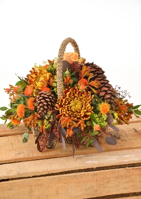A festival of delight in this autumnal basket including large bloom Chrysanthum, Carthamus and pine cones.