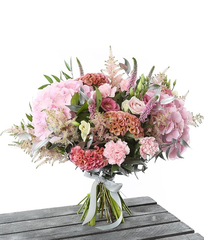 Stunning pale pinks and silver hand tied bouquet, including pale pink hydrangea, pale pink astilbe, celosia, carnations, veronica and blending green and silver foliage ‘