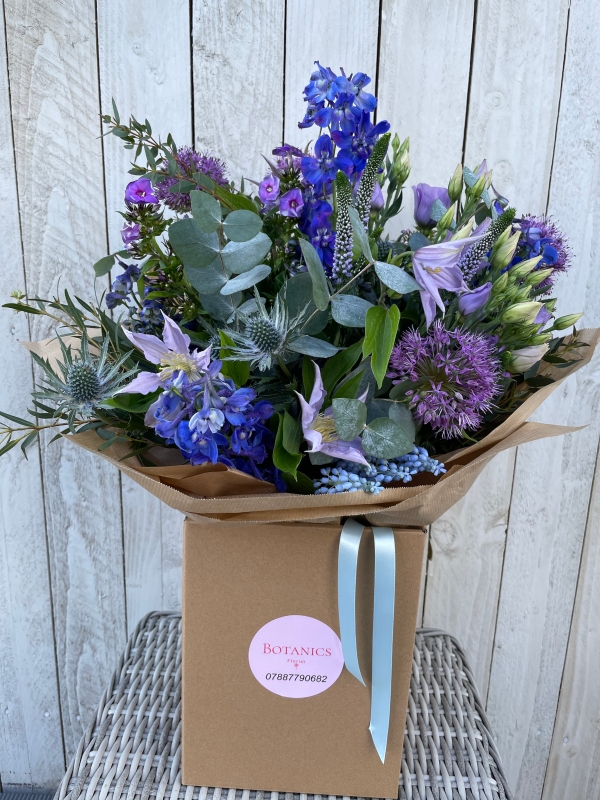 This rustic hand tied bouquet with its divine Blue delphinium, soft clematis, lilac lisianthus and complimenting seasonal foliage.
