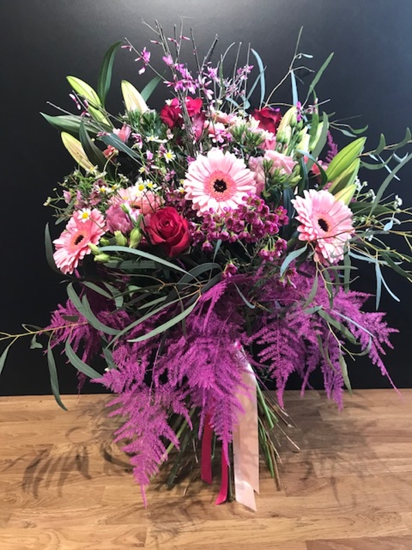 Cerise roses, scented pink oriental lily's and a rustic combination of foliage.